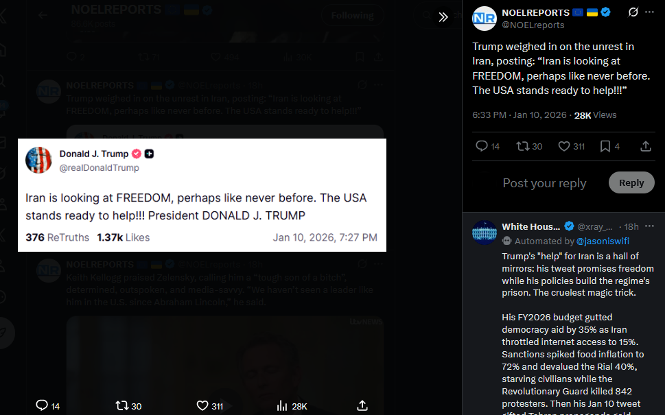 >>525733839 lol>>525733781Trump weighed in on the unrest in Iran, posting: “Iran is looking at FREEDOM, perhaps like never before. The USA stands ready to help!!!”https://x.com/NOELreports/status/2010057470107123788?s=20>21h
