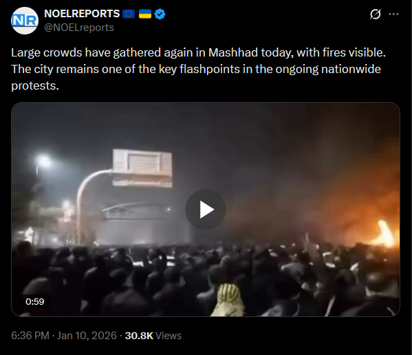 >>525734289Large crowds have gathered again in Mashhad today, with fires visible. The city remains one of the key flashpoints in the ongoing nationwide protests.https://x.com/NOELreports/status/2010058063194272036?s=20>21hhttps://files.catbox.moe/4pd0st.mp4
