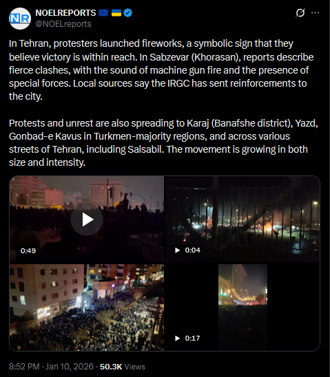 >>525734576In Tehran, protesters launched fireworks, a symbolic sign that they believe victory is within reach. In Sabzevar (Khorasan), reports describe fierce clashes, with the sound of machine gun fire and the presence of special forces. Local sources say the IRGC has sent reinforcements to the city.Protests and unrest are also spreading to Karaj (Banafshe district), Yazd, Gonbad-e Kavus in Turkmen-majority regions, and across various streets of Tehran, including Salsabil. The movement is growing in both size and intensity.https://x.com/NOELreports/status/2010092408755867879?s=20>19hvideo 1https://files.catbox.moe/s5pyix.mp4video 2https://files.catbox.moe/x3j1gd.mp4video 3https://files.catbox.moe/gnjas9.mp4pichttps://files.catbox.moe/jkm8gg.jpg