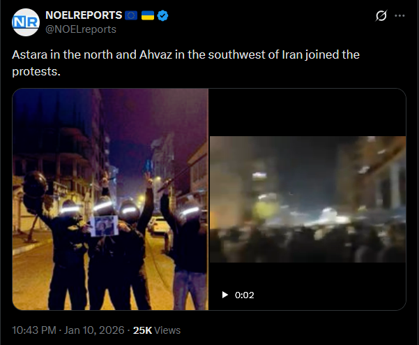 >>525735301Astara in the north and Ahvaz in the southwest of Iran joined the protests.https://x.com/NOELreports/status/2010120244967158083?s=20>17hpic https://files.catbox.moe/ei82c0.jpgvideo https://files.catbox.moe/vf3sph.mp4