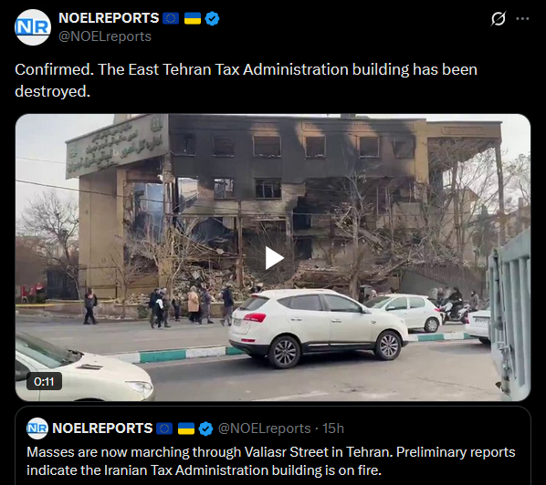 >>525735219Masses are now marching through Valiasr Street in Tehran. Preliminary reports indicate the Iranian Tax Administration building is on fire. Across multiple cities, disturbing updates are pouring in, wounded and killed numbers are rising fast. The regime is throwing everything it has at suppressing the uprising.https://x.com/NOELreports/status/2010114843118809113?s=20>18hhttps://files.catbox.moe/v6nf43.mp4