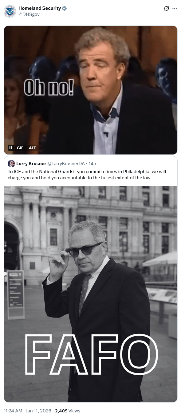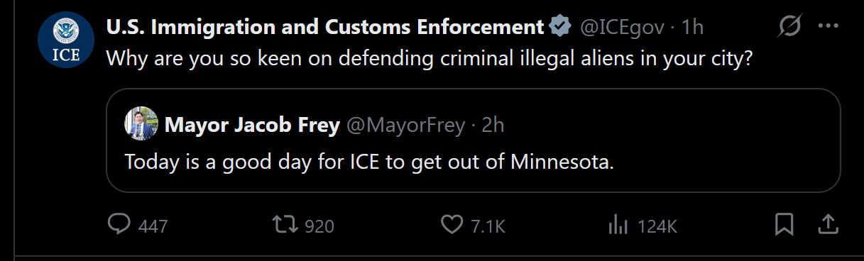 >>525738210I'm almost sympathetic. This woman is clearly trying to show out for her community. And she agreed they will work with ICE. But she spent the entire statement making claims that ICE isn't a lawful authority, that ICE doesn't have lawful or legal standing to stop crimes, and that they cannot have their faces covered because of local law. One direct implication is that she will be sending bullets (that's how I read smoke) to disrupt ICE if there's an accusation of a crime and ICE doesn't agree to be arrested by Philly cops. The more important, again, she's letting the community believe that ICE isn't a lawful or professional, it is an illegitimate, organization with authority and proper capacity to identify enemies of the US in our borders.She needs a call from the Criminal in the Whitehouse's chief law enforcement officer to clarify her intents.