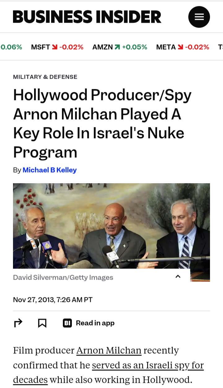 Arnon Milchan worked for decades as an Israeli spy, associated with MOSSAD/LAKAM. He was tasked with securing technology for Israel’s secret nuclear weapons program, economic espionage, & arms smuggling. At one point he operated 30 companies in 17 different countries. Milcharn reportedly became a key operative for LAKAM chief Benjamin Blumberg and top spy Rafi Eitan, who ran jailed spy Jonathan Pollard and infiltrated a U.S. company to obtain tons of highly-enriched uranium. Milchen, who is good friends with former Israeli President Shimon Peres, also said that he helped Israel obtain key nuclear equipment and information while Peres established the *Dimona nuclear reactor.Milchan's company, Heli Trading Co., brokered the shipment of 800 krytons — sophisticated triggers for nuclear weapons — from the California company MILCO International Inc. to the Israeli Ministry of Defense between 1979 and 1983.In 1985, the U.S. indicted and extradited MILCO President Kelly Smyth on 30 counts of smuggling and making false statements.Here's what Smyth told FBI agents in Los Angeles (via IRMEP):Smyth details his recruitment by Arnon Milchan, meetings with Benjamin Netanyahu who then worked at smuggling front Heli Trading (Milchan Brothers Trading Company) in Israel, and how the "Project Pinto" smuggling operation was rolled up after his arrest for smuggling 800 nuclear triggers and subsequent flight from the U.S.Milchan's espionage was clearly integral to Israel's nuclear program.see NUMEC & Apollo Affair