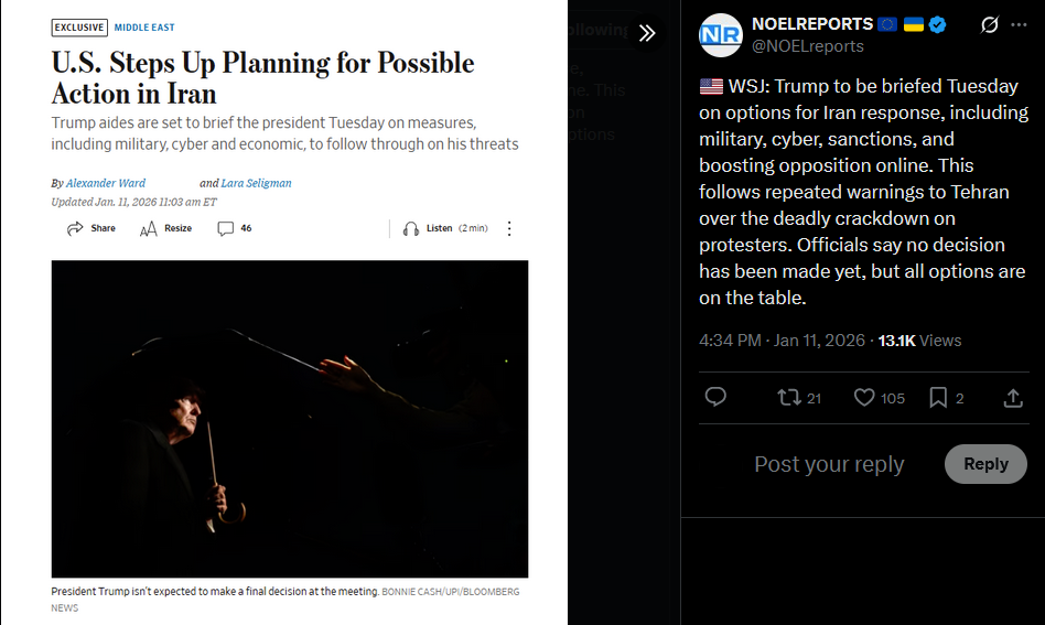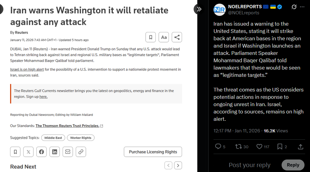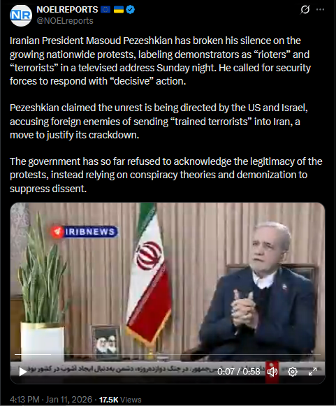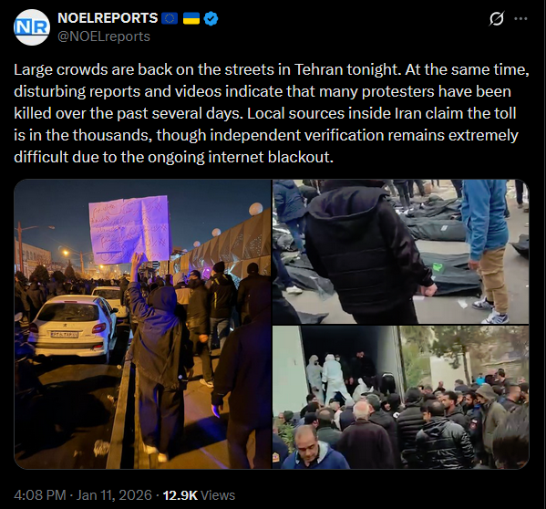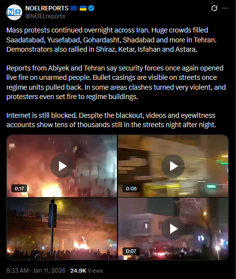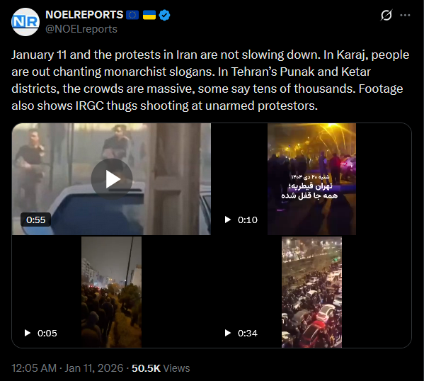 January 11 and the protests in Iran are not slowing down. In Karaj, people are out chanting monarchist slogans. In Tehran’s Punak and Ketar districts, the crowds are massive, some say tens of thousands. Footage also shows IRGC thugs shooting at unarmed protestors.https://x.com/NOELreports/status/2010140895568625810?s=20>16hvideo 1https://files.catbox.moe/tfw5r0.mp4video 2https://files.catbox.moe/5f5jqq.mp4video 3https://files.catbox.moe/pmhce0.mp4video 4https://files.catbox.moe/g237lw.mp4