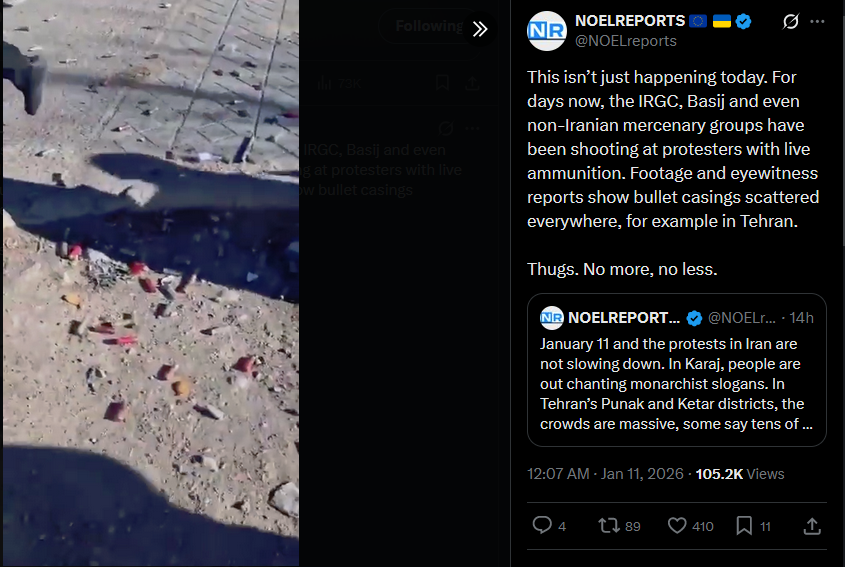 >>525735732This isn’t just happening today. For days now, the IRGC, Basij and even non‑Iranian mercenary groups have been shooting at protesters with live ammunition. Footage and eyewitness reports show bullet casings scattered everywhere, for example in Tehran.Thugs. No more, no less.https://x.com/NOELreports/status/2010141442162012609?s=20>16h