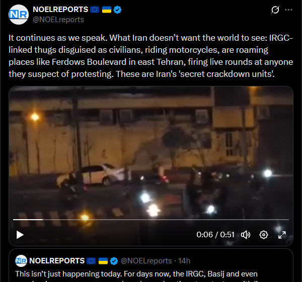 >>525735813It continues as we speak. What Iran doesn’t want the world to see: IRGC-linked thugs disguised as civilians, riding motorcycles, are roaming places like Ferdows Boulevard in east Tehran, firing live rounds at anyone they suspect of protesting. These are Iran's 'secret crackdown units'.https://x.com/NOELreports/status/2010142457862754422?s=20>16hhttps://files.catbox.moe/7tbv5n.mp4