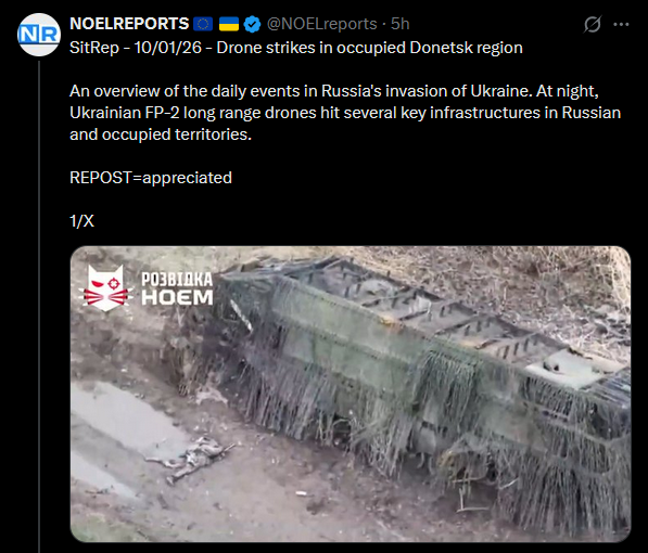 SitRep - 10/01/26 - Drone strikes in occupied Donetsk regionAn overview of the daily events in Russia's invasion of Ukraine. At night, Ukrainian FP-2 long range drones hit several key infrastructures in Russian and occupied territories. https://x.com/NOELreports/status/2010265137169551507?s=20