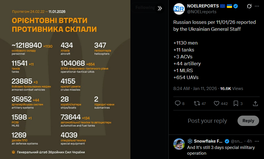 >>525735486Russian losses per 11/01/26 reported by the Ukrainian General Staff+1130 men+11 tanks +3 ACVs+44 artillery+1 MLRS+654 UAVshttps://x.com/NOELreports/status/2010266558581637258?s=20