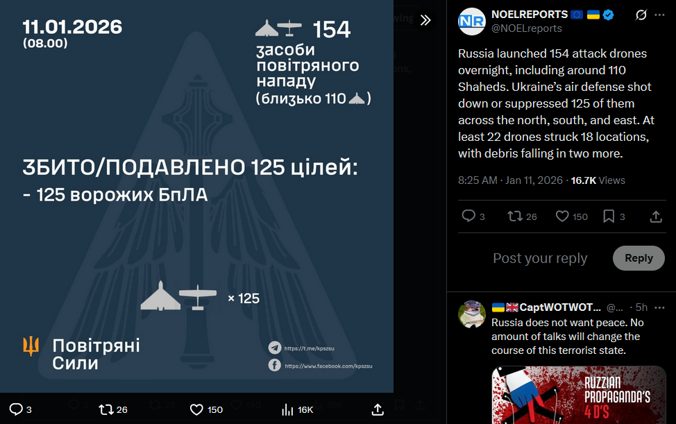 Russia launched 154 attack drones overnight, including around 110 Shaheds. Ukraine’s air defense shot down or suppressed 125 of them across the north, south, and east. At least 22 drones struck 18 locations, with debris falling in two more.https://x.com/NOELreports/status/2010266698969199058?s=20