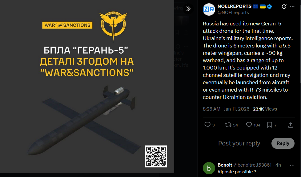 Russia has used its new Geran-5 attack drone for the first time, Ukraine’s military intelligence reports. The drone is 6 meters long with a 5.5-meter wingspan, carries a ~90 kg warhead, and has a range of up to 1,000 km. It's equipped with 12-channel satellite navigation and may eventually be launched from aircraft or even armed with R-73 missiles to counter Ukrainian aviation.https://x.com/NOELreports/status/2010267119749849520?s=20