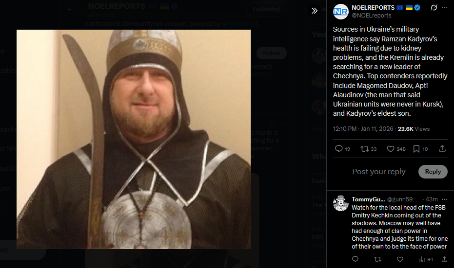 >>525735486Sources in Ukraine’s military intelligence say Ramzan Kadyrov’s health is failing due to kidney problems, and the Kremlin is already searching for a new leader of Chechnya. Top contenders reportedly include Magomed Daudov, Apti Alaudinov (the man that said Ukrainian units were never in Kursk), and Kadyrov’s eldest son.https://x.com/NOELreports/status/2010323382055641157?s=20