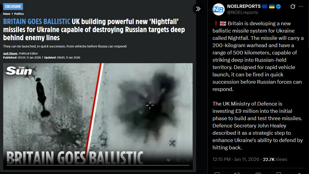 Britain is developing a new ballistic missile system for Ukraine called Nightfall. The missile will carry a 200-kilogram warhead and have a range of 500 kilometers, capable of striking deep into Russian-held territory. Designed for rapid vehicle launch, it can be fired in quick succession before Russian forces can respond. The UK Ministry of Defence is investing £9 million into the initial phase to build and test three missiles. Defence Secretary John Healey described it as a strategic step to enhance Ukraine's ability to defend by hitting back.https://x.com/NOELreports/status/2010324603894124957?s=20