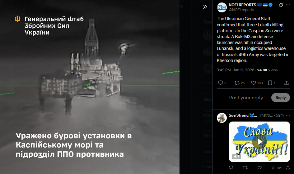 >>525735486The Ukrainian General Staff confirmed that three Lukoil drilling platforms in the Caspian Sea were struck. A Buk-M3 air defense launcher was hit in occupied Luhansk, and a logistics warehouse of Russia’s 49th Army was targeted in Kherson region.https://x.com/NOELreports/status/2010378647975424355?s=20