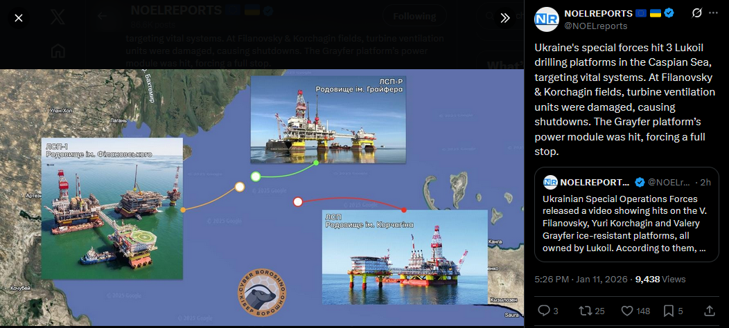 >>525739814>>525739371>>525735486Ukraine's special forces hit 3 Lukoil drilling platforms in the Caspian Sea, targeting vital systems. At Filanovsky & Korchagin fields, turbine ventilation units were damaged, causing shutdowns. The Grayfer platform’s power module was hit, forcing a full stop.https://x.com/NOELreports/status/2010402917312860285?s=20