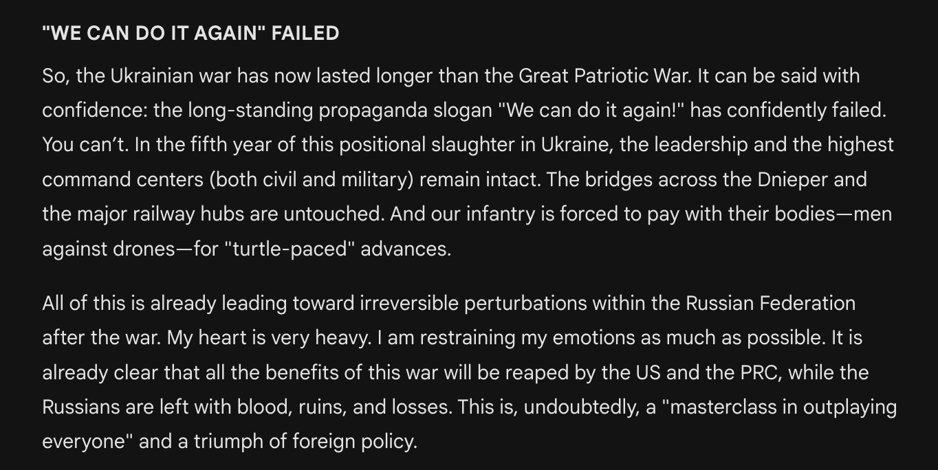 As of today, Russia’s full-scale war on Ukraine (1,418 days) has officially lasted longer than the entire period of WWII in which Moscow was no longer aligned with Nazi Germany, but was instead fighting against it (thanks to American Lend-Lease).In exchange for continuing to placate his obsession with Ukraine, the Russian dictator has progressively jettisoned Moscow’s entire global network of colonies, protectorates, and client states. Syria, Venezuela, Iran – and more to follow – the dominoes are lining up like 1989. As the US eagerly scoops up the pieces, Moscow’s nightmare has become an irrevocable and blinding reality.The Gargoyle Midget Czar bit off more than he could chew, and generations of Russians will pay the price.