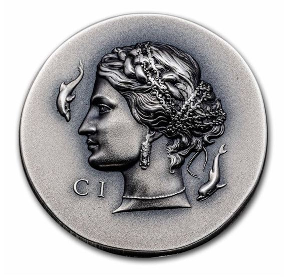 Cook Islands silver coin from 2023 with the Goddess Arthusa. Based on an ancient Greek coin design.