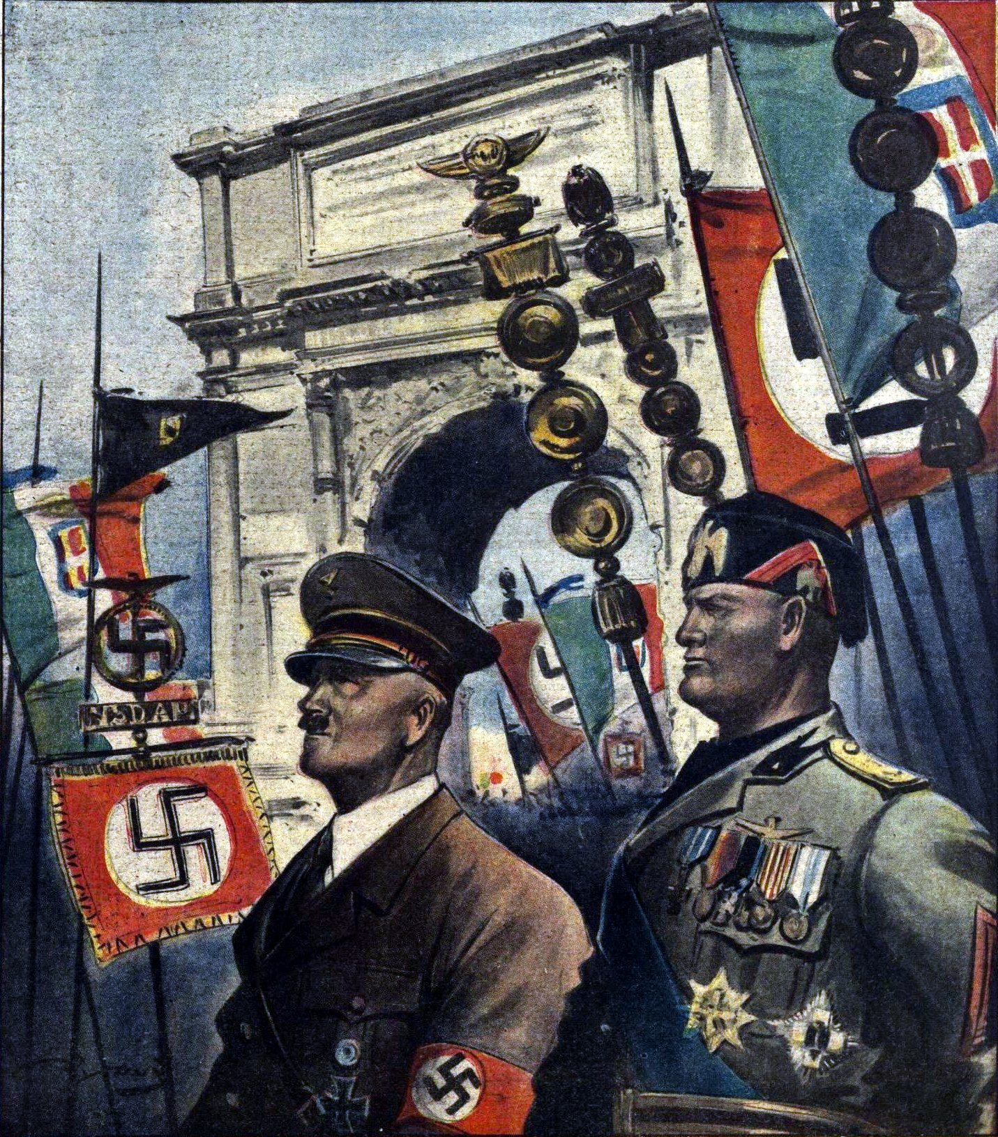 La Tribuna Illustrata n.19, 1938:>The Duce of the new Italy welcomes the Führer of the reborn Germany to imperial Rome. Two revolutions and two peoples enthusiastically cheer at the new meeting.