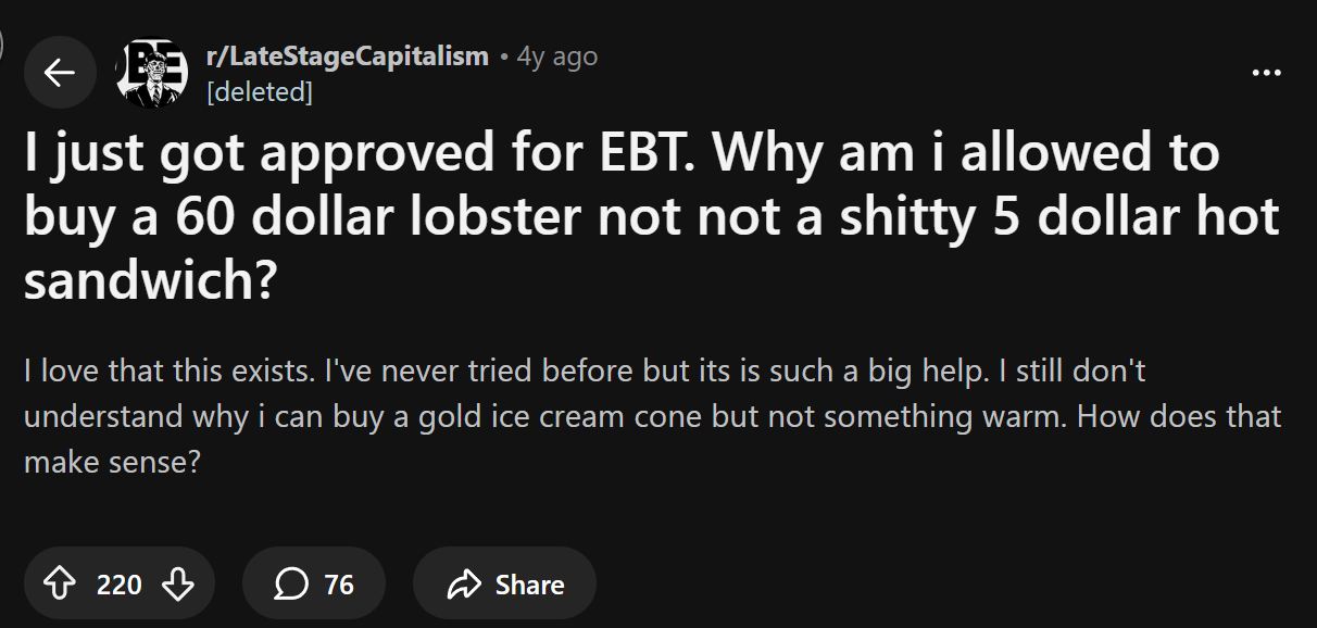 That’s dumb. Just stop the food stamps.