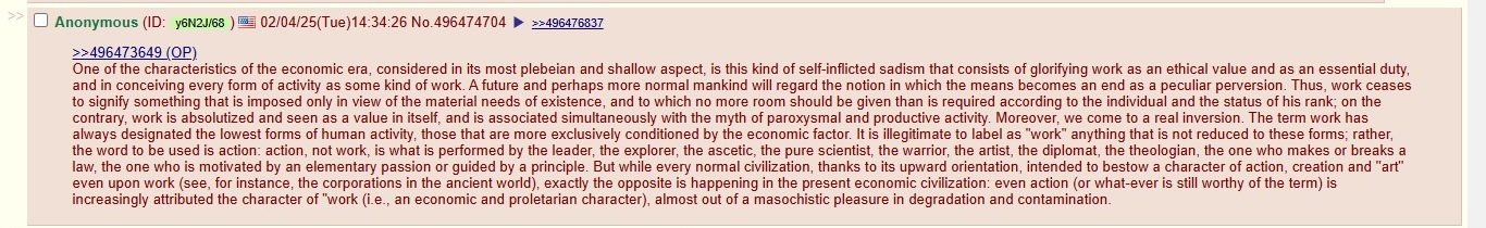 The biggest lie in the world. Scarcity was defeated through tech awhile ago. Sure, a tiny amount of real work is still necessary (far less than boomers had to do) but that's all. Work is just daycare to keep people too busy to think or rebel. Your mentality is just a different flavor of Khmer Rouge. Why do you think NEETs make the ZOG state SEETHE? We could literally have working quantum computers and Star Trek tier andriods to do all the work for us and idiots like you would still be like "You just gotta work bro". Mass remigration (under the threat of lethal force) + Americans enjoy Star Trek post scarcity society forever is the correct future.