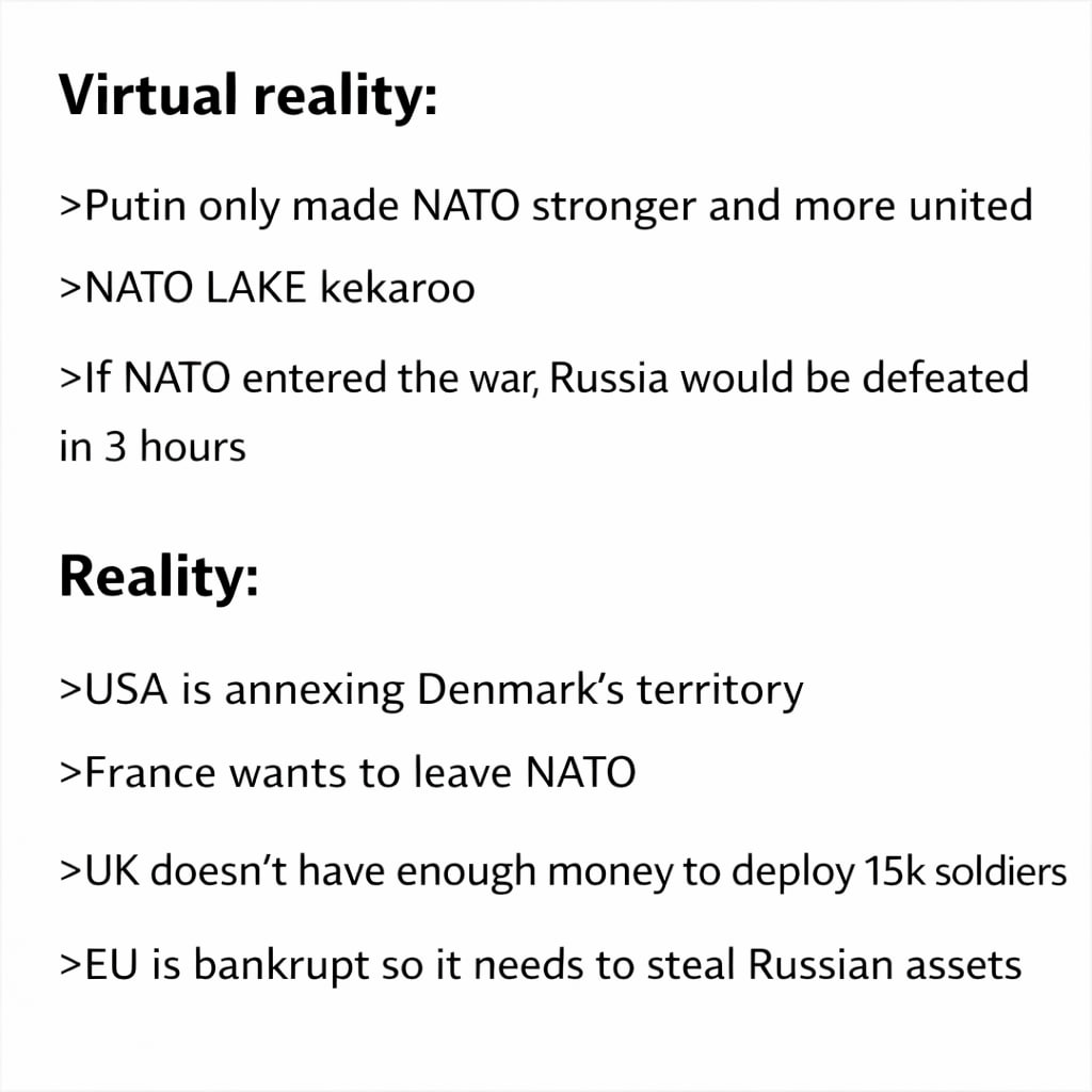 >>525756093>Current war - became completely dependent on the US, lost Greenland, lost resources, about to lose morelmao, is there a single Russian that isn't in a constant state of butthurt fueled delusion?