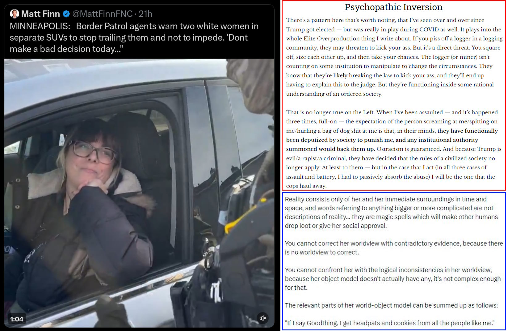 to solidifying the female equivalent of a fascist in a way that sticks. 40 years ago the left correctly figured out they don't need any arguments or policies at all, they simply can call whites racist/fascist and most npc's will cave because they don't want to be perceived that way.It never, ever, ever works to call the other side "No, YOU'RE the real fascist!" You need a new category. Frankly I think "groomer" was it but the right didn't stick with it/backed off. But since white women are the real lever destroying society, the bipolar/narcissistic personality disorder/envious/pathologically delusional/coddled meme has a real chance to stick since women really, really don't want to be seen this way. Of course the ones who have given up will pretend to embrace it, but no young women (the most rabid leftists) do NOT want to be seen this way.It's critical to find a specific name that will stick to such women, and "Karen" isn't nearly enough, nor is "SJW". But I'm hopeful someone will figure one out.