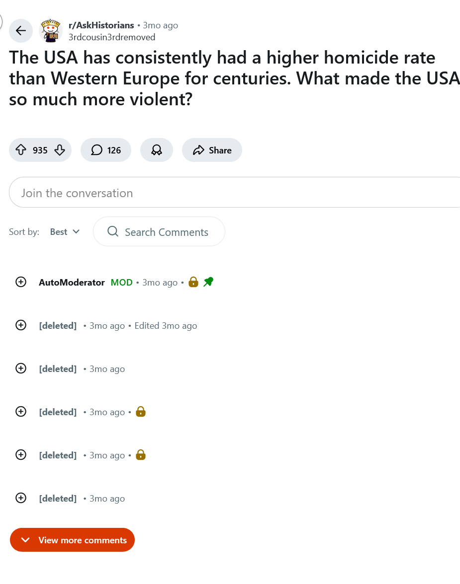 >>525775063First serious answer?Europe was bounded by political and social upheavals, and of course w2ars, and the displacement of Aristocracy.Murder is generally an act of individual instigation.During the American settlement and frontier, there was much more opportunity for an individual "acting out".