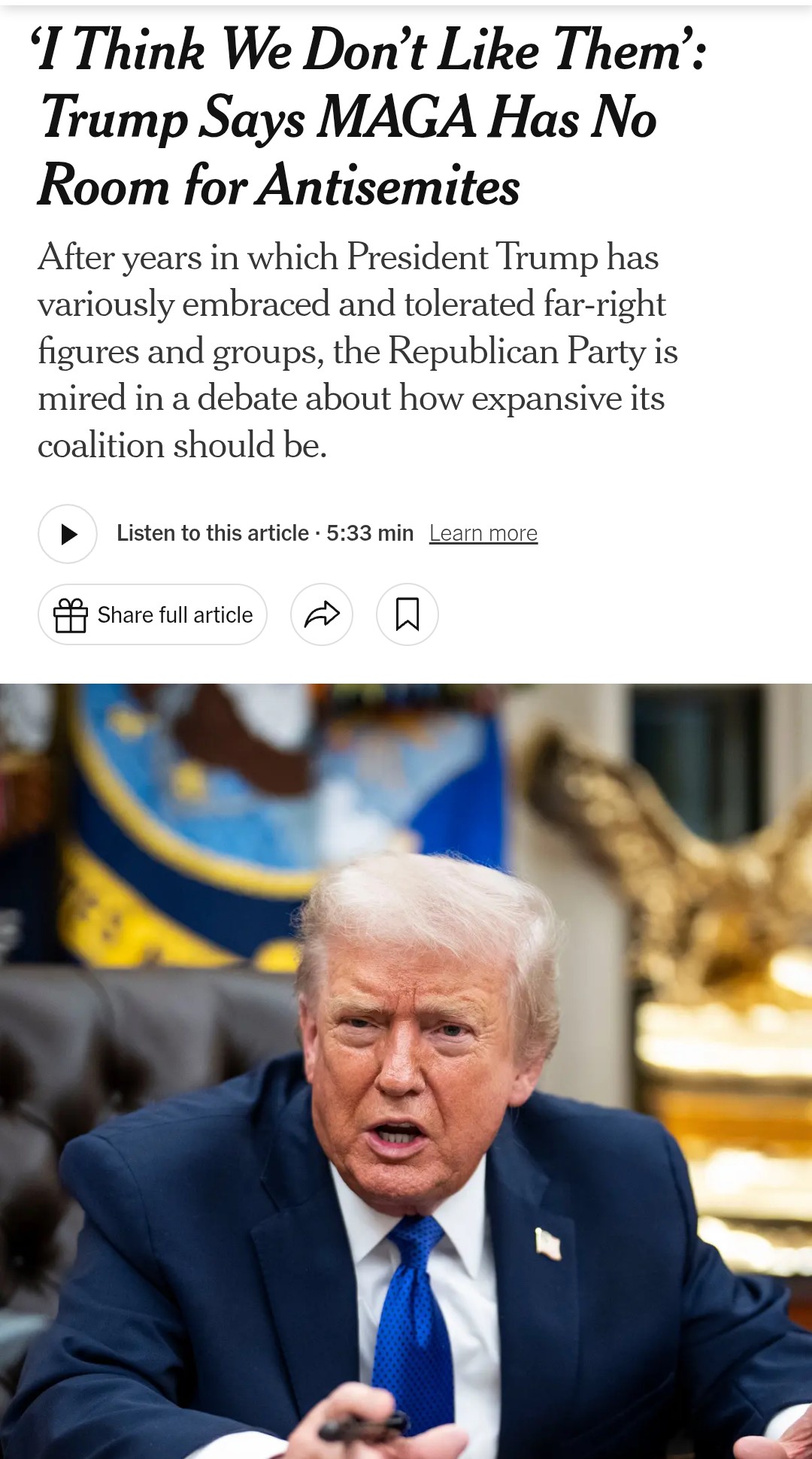 >After years in which President Trump has variously embraced and tolerated far-right figures and groups, the Republican Party is mired in a debate about how expansive its coalition should be.>President Trump said that neither the Republican Party nor the MAGA movement had room for people with antisemitic views, his most direct public statement yet in a debate pulsing through his movement over the inclusion of supporters who spread hate.>“I think we don’t need them,” he said on Wednesday during an interview with The New York Times, when asked whether such people had a place in his coalition. “I think we don’t like them.”>Mr. Trump’s coalition has started to splinter over how much support the United States should provide to Israel, but the president has repeatedly bragged about his support for Israel. In the interview with The Times, Mr. Trump spoke about the recent prize he was awarded by Israel and referred to his Jewish family members.>“My daughter happens to be Jewish, beautiful, three grandchildren are Jewish,” he said. “I’m very proud of them. I’m very proud of the whole, that whole family. I am the least antisemitic person probably there is anywhere in the world.”Based Trump at it again.