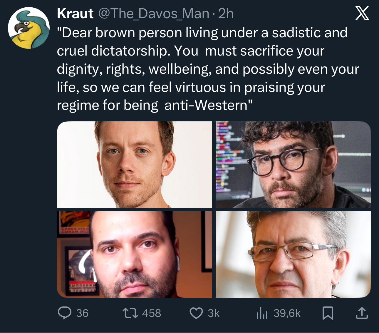 It's truly inspiring. This is what real feminism looks like, not privileged, green-haired women flashing their sagging breasts in front of cops and kids for attention.The more I see the brave women of Iran facing genuine oppression, risking everything. arrest, torture, death just to fight for basic freedoms, the more ashamed I feel for so many in the West. People here throw around the word 'oppressed' while living in safety and comfort, completely blind to how privileged they are FOR WAY TOO LONG. It's embarrassing. It's shameful.