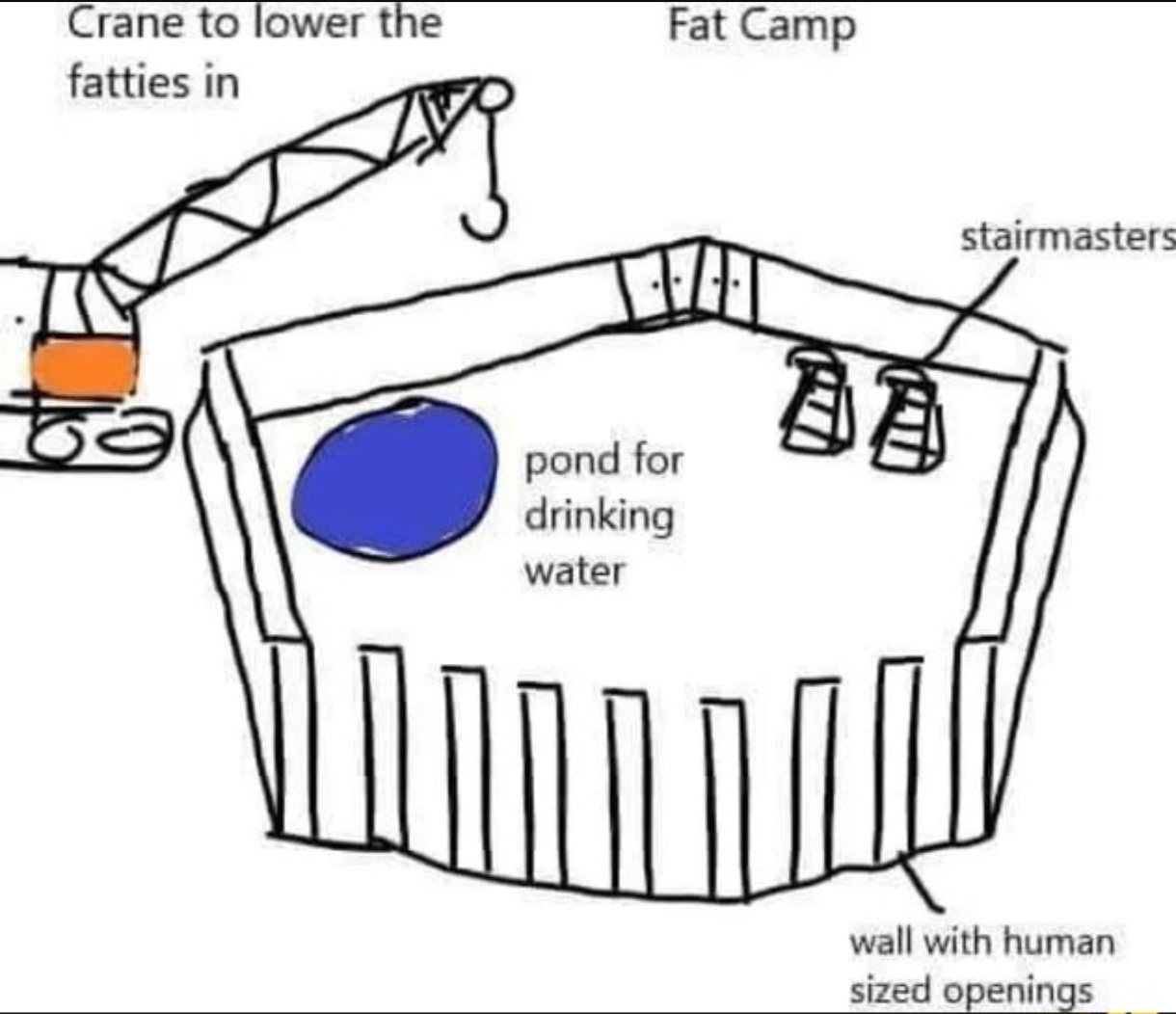 If the government told me "hey we've got a fat camp where you can go get in shape, dont worry about your bills for a little while" I would 100% support and do this