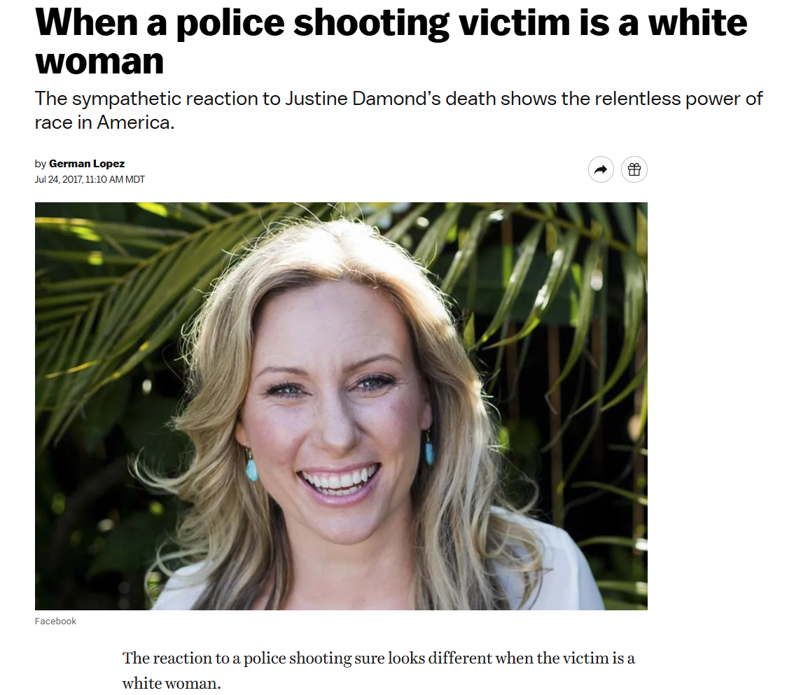 Picrel is Vox covering the murder of Justine Damond who was shot by a somalian lightbulb headed policeman (Mohamed Noor.) This took place in Minneapolis in July 2017. He only served 3 years in prison because of his black privilege.