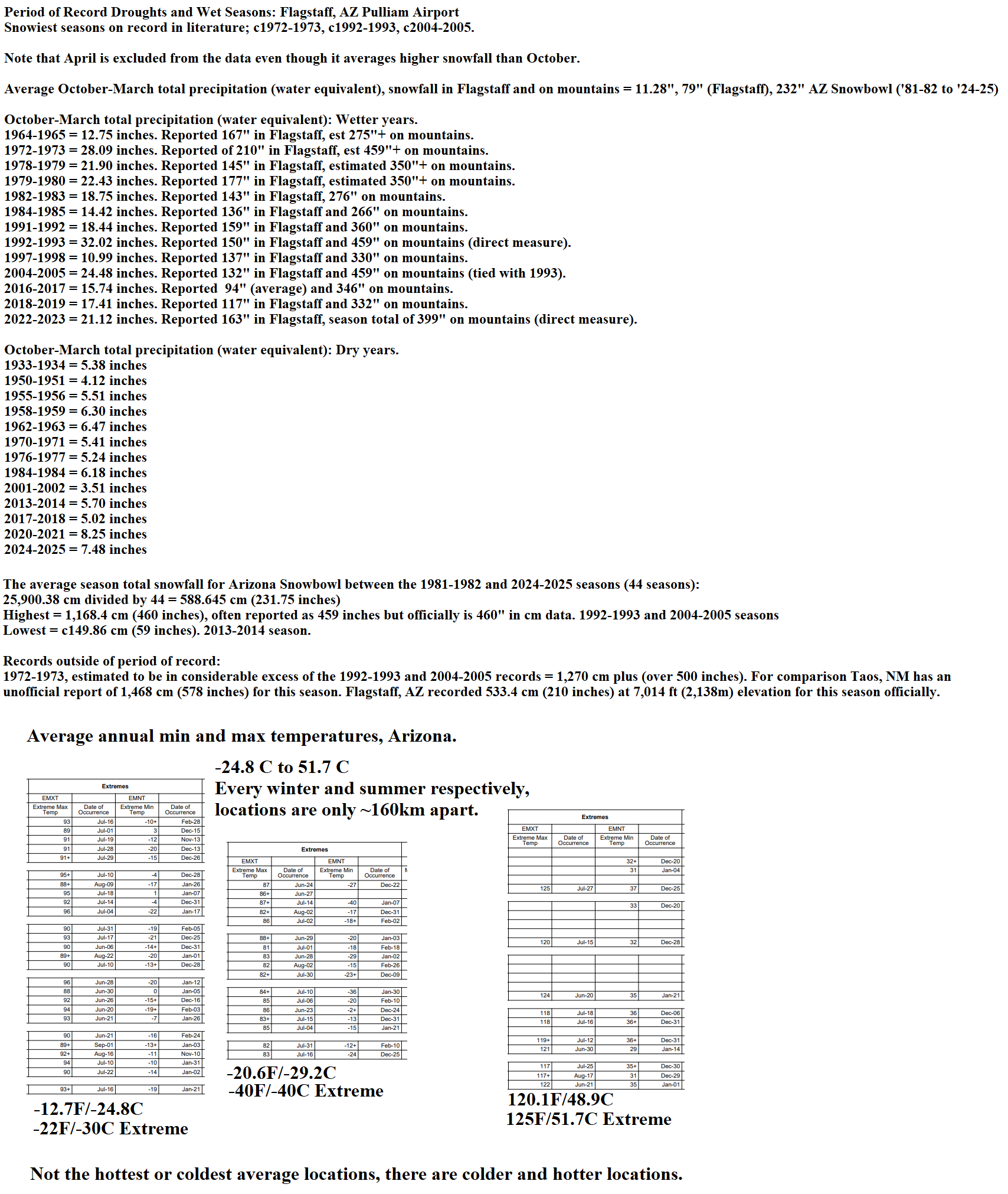 Also here's proof of the statement regarding annual average extreme temps in AZ, with also attached snowfall records and averages. -24.8C to 51.7 C, one city with 200-220cm average winter snowfall, mountains average 589cm (not dissimilar to parts of the Alps). This is also in modern recording time periods (since 1900s), and these records would have been massively broken if you started recoding in the 1400s instead (little ice age onset). People from temperate climates (British isles, Germany, entire southern hemisphere, largely oceanic climates) have trouble adjusting to subtropical and temperate naturally variable climates (western North America, Siberia etc). And also the Nords only survived in Iceland during the little ice age because they cut down all of the forests, literally 90%+ of them. Whereas inuits survived without forests by utilizing a different lifestyle during cold periods.