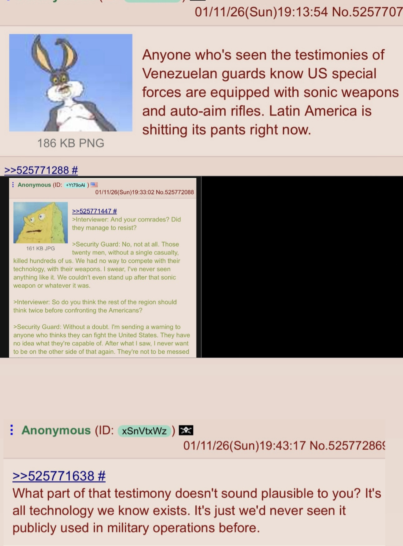 >>525810561The auto aim rifles are just really advanced ced scopes with a targeting computer in them. The scope costs more than the rifle and ya they will help a trained man pick you off from far. The sonic weapon is interesting. Was it hand held was it attached to a chopper? Did they drop it and it just burst out with the sound. We know about directed sound stuff it seems to be something like that.Also the interview itself could have been planted by the government and just be bullshit.