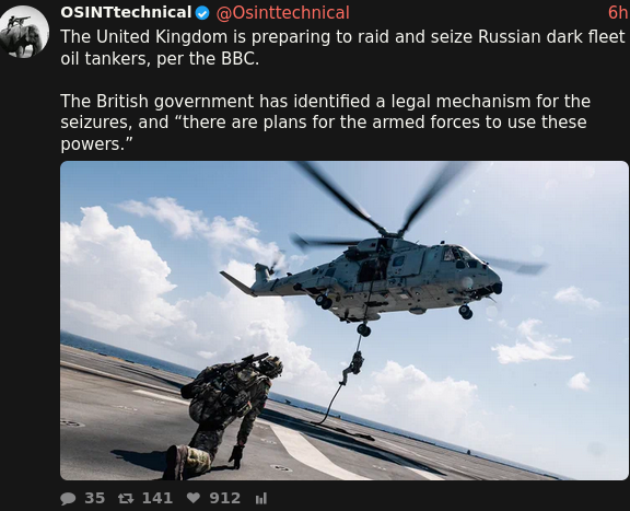 >>525810985I keep hoping that these guys will grow a spine and actually do something, but it seems Russia is just paper. This turn of events is unsurprising though, and the British are just returning to their roots as sea pirates. They saw how easily the US stole Venezuelan Oil ships, and they want to go all-in on that easy money.