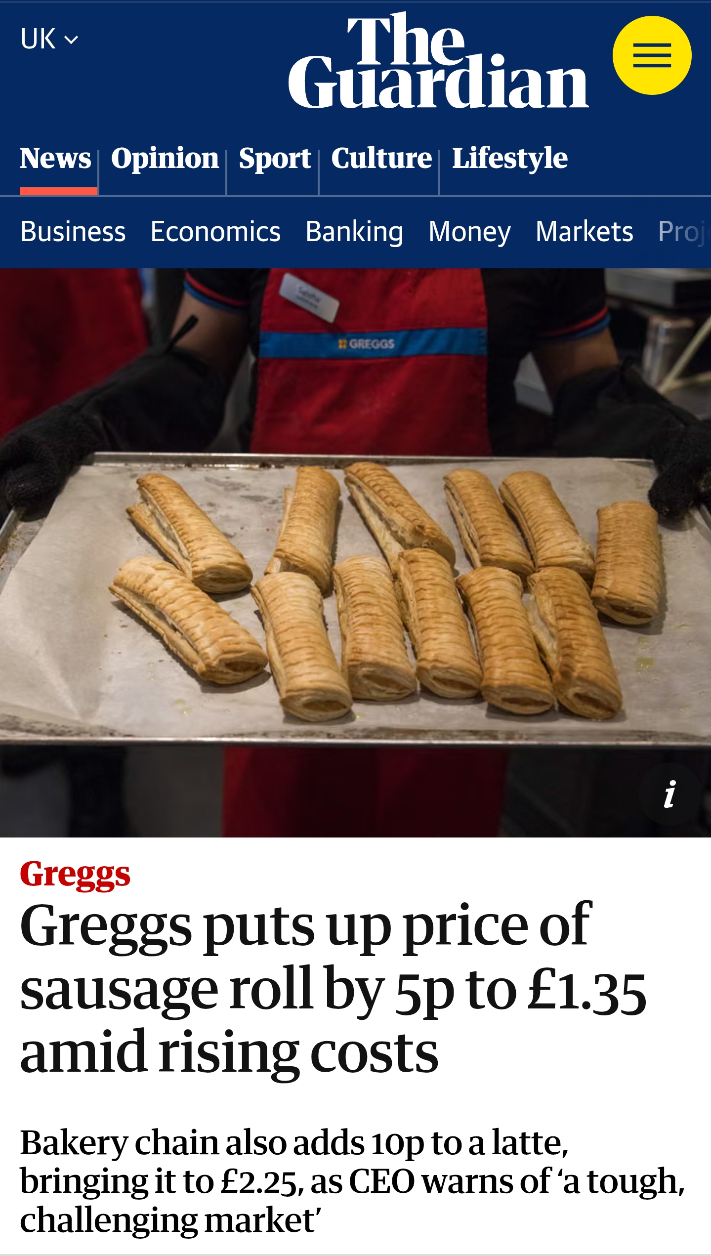 >Newshttps://www.theguardian.com/business/2026/jan/08/greggs-puts-up-price-of-sausage-roll-by-5p-to-135-amid-rising-costs