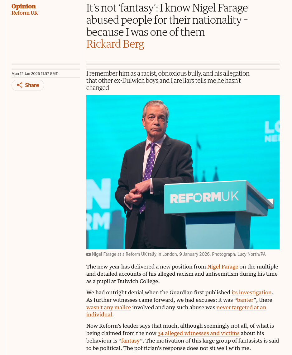 Thoughts?>It’s pathetic of [Farage] to pretend he shouldn’t be open to personal scrutiny>To me, he remains a spineless little person incapable of making anything betterhttps://www.theguardian.com/commentisfree/2026/jan/12/nigel-farage-abuse-nationality-racist-dulwich-college