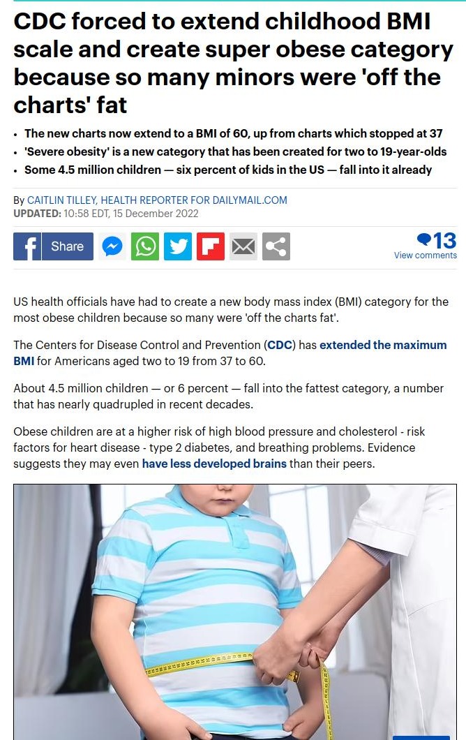 >>525817424"Obesity" used to be defined as "at or above the 95th percentile in Body Mass Index." So it was mathematically impossible for the rate of obesity to be anything other than 5%.Around 2001 they had to freeze the definition at BMI > 25 kg/m2 because it was becoming meaningless.