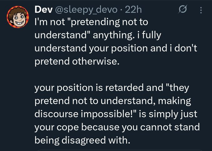 >>525824564That tweet is stupid. It just holds true for both sides. And the "pretend not to understand" thing is real with leftists. They pretend not to know things like basic context or facts of events and issues and effectively become timewasters that force you to re-litigate everything in every instance of discussion.