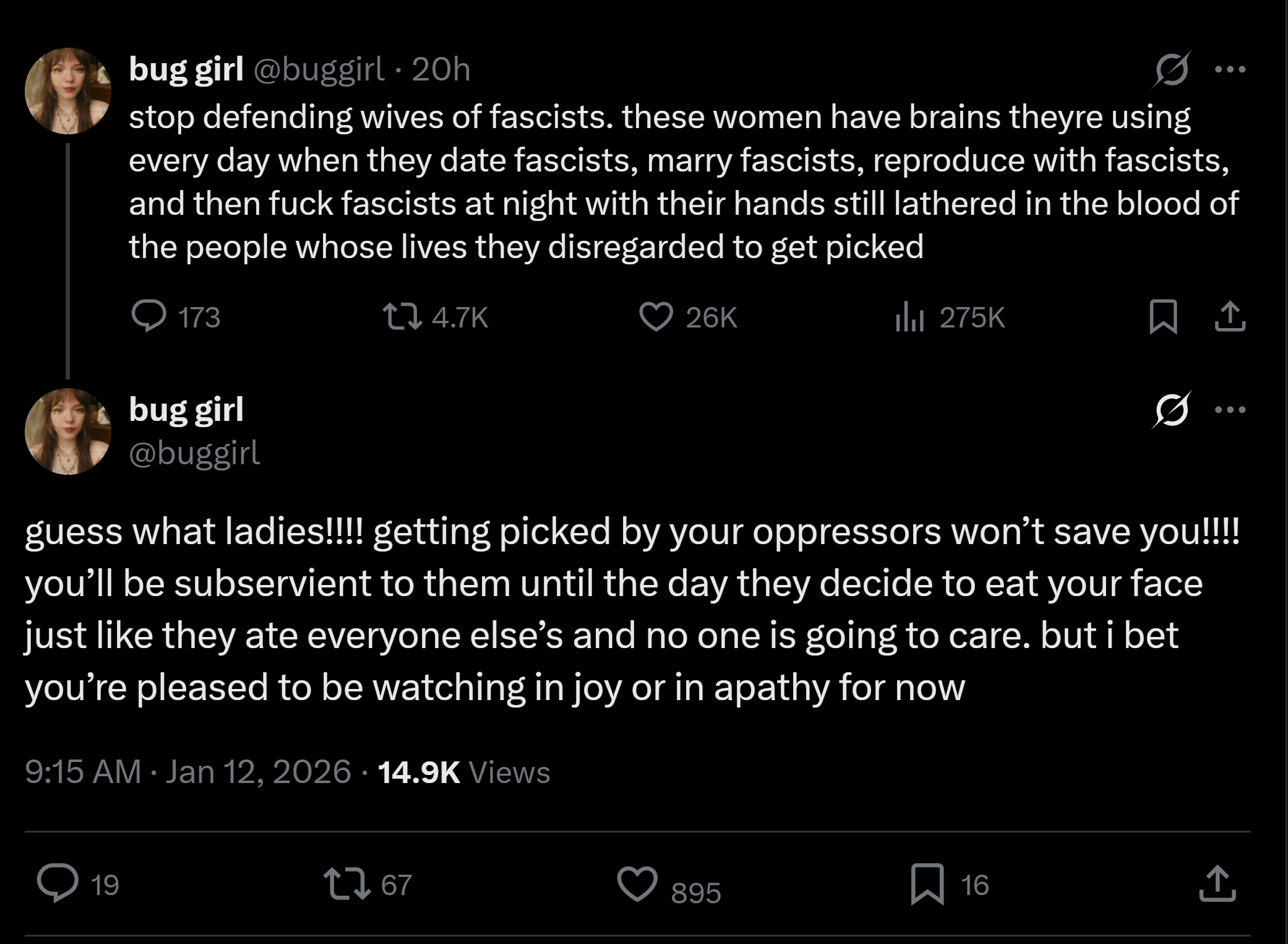 >>525831875she posted this because she got rejected by a fascist guy she had a crush on.