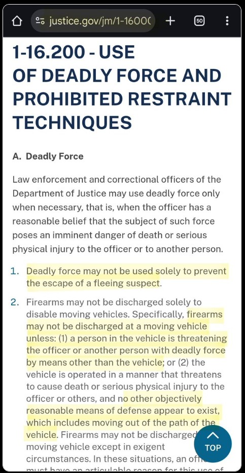 >>525833613>>525833613>>525835525>>525836535>>525836653>>525837493>are allowed to use deadly force in certain situationsCorrect, but only specific situations that are clearly explained here. Getting out of the way of the vehicle is the protocol for example. As per the DOJ website.This screenshot kills the migger.