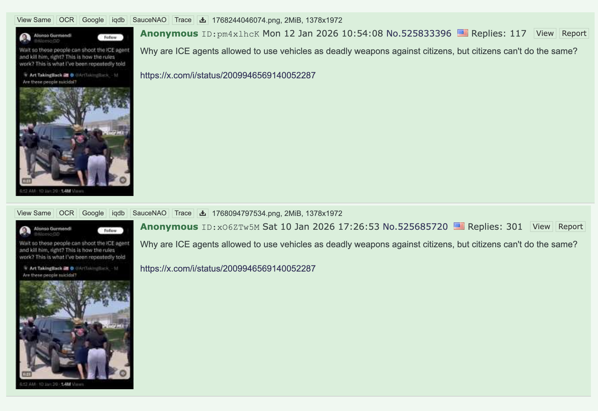 >>525833396>Why are ICE agents allowed to use vehicles as deadly weapons against citizens, but citizens can't do the same?Because you are interfering with a federal police operation, which is a felony.