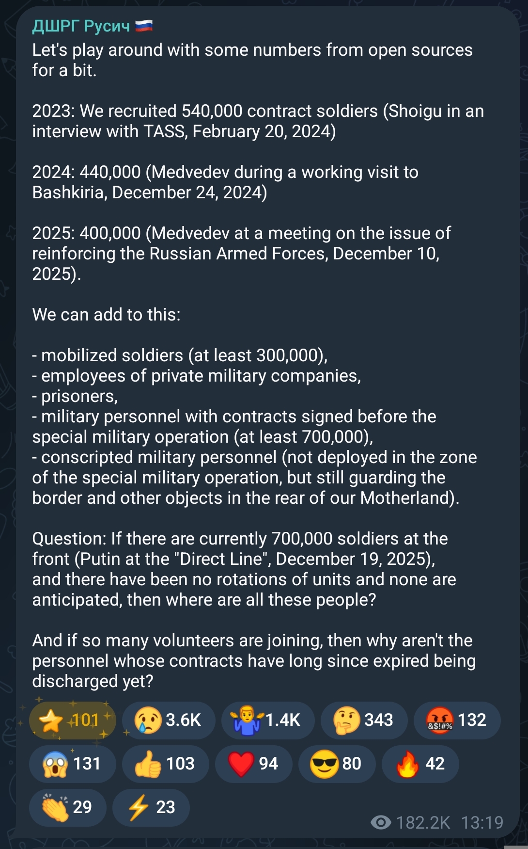 2. It's not about outcomes at all and you're only confused if you view the war as if Russia had legitimate reasons to invade - that is once X objective is achieved then they stop. In fact the war is a pretext for immense theft and wealth hoarding by Putin and his inner circle. They go on television and pretend to care about Russia and NATO and write essays about all sorts of strategic objectives and so on, but at the same time pump tens of trillions of rubles into Rostech which then supplies soldiers with donkeys. Who gets to split the difference? Hundred trillion ruble question.