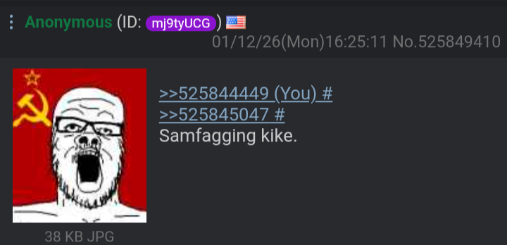 >>525842175When my enemies kill my enemies, I'm not gonna cry about it like you, jew.Go block an ICE truck and drive away when they come at you, I'd love to see you do that!I simply hate jews, leftists, niggers, and every faggot who tries to convince me to care about any of this faggotry. So again, I think you should kill yourself. If you need pointers, I can send you some, even if you just have a bottle of Tylenol, we can get this job done!