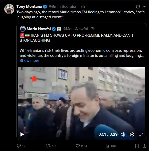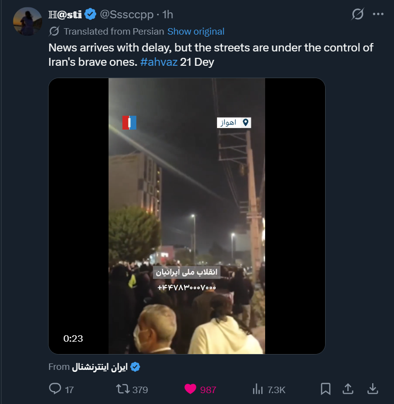 >>525840003Earlier today I believe: Pro Iranian regime demonstrationhttps://xcancel.com/warsurveillance/status/2010804728054362196#m