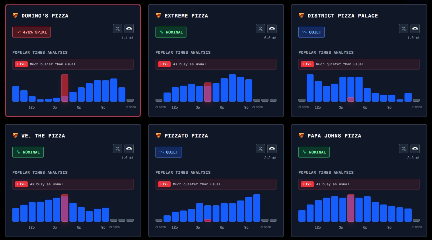 The Pentagon Pizza index is exploding right now;- Domino's Pizza: 1000% spike in orders.- Extreme Pizza: 213% spike.- Pizzato Pizza: 217% spike.- Papa John's: 192% spike.