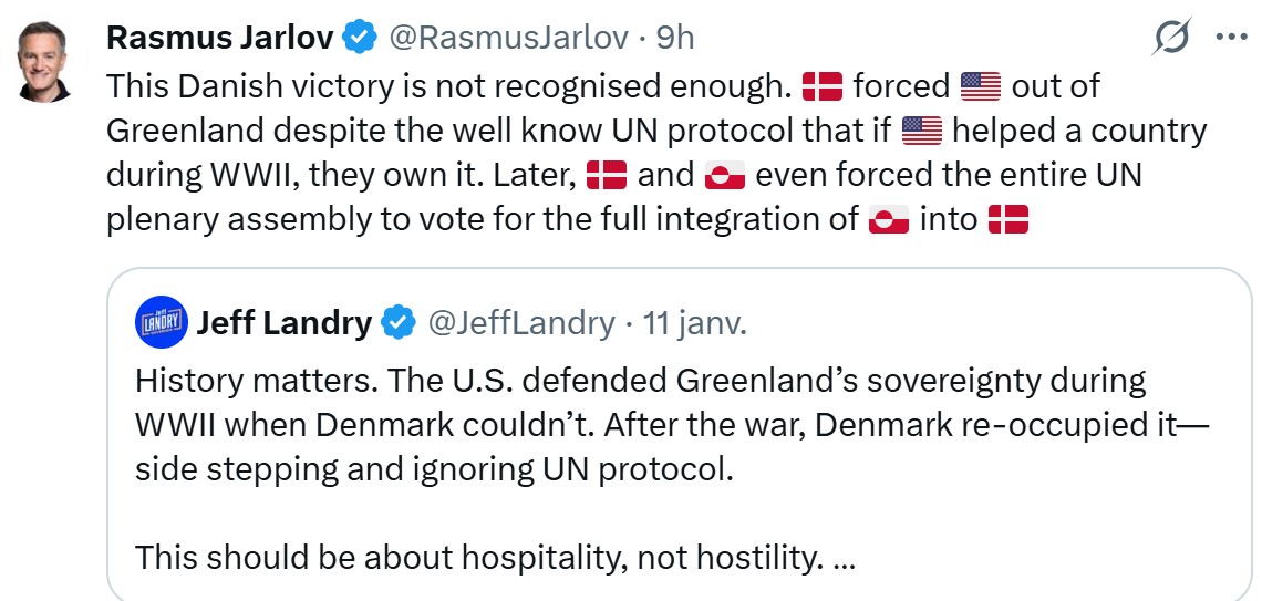 https://x.com/OJoelsen/status/2010729075401265202So unless we get some member of the opposition to openly support the US or they buckle at the last minute it looks we're gonna have to take Greenland the hard way.