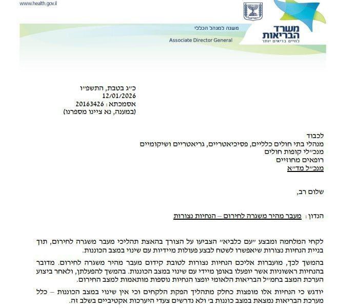 >>525842491>directly translated from google translate with no proofreadingMinistry of HealthDeputy to the general managerAssociate Director Generalfor a healthier lifeAs the day of Tevet, the healing12/01/202620163426 Mother(In response, please indicate our number)in honor ofGeneral, psychiatric, geriatric and rehabilitation hospital administratorsHealth fund managersDistrict doctorsFrom the director of MediaHello,Subject: Rapid transition from routine to emergency - enclosed guidelinesThe lessons of the war and Operation Ya'am Kalavi pointed to the need to accelerate the transition processes from routine to emergency, while building detailed guidelines that will allow the field to carry out immediate actions with a change in the state of alert.Following this, you will be provided with detailed instructions to promote a rapid transition from routine to emergency. These are initial instructions that will be implemented immediately upon a change in the state of alert. Following their implementation, and after an assessment of the situation, additional instructions tailored to the emergency situation will be distributed via the National Health Commission.It should be emphasized that these guidelines are being distributed as part of the lessons learned process and that there is no change in the state of alert at all.The health system is on alert level B and no active preparedness measures are required at this stage.