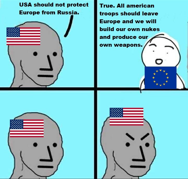 Euroseeethe has successfully convinced millions of americans that disbanding NATO is now a preferable choice.We asked for a small payment after GENERATIONS of being at your beck and call and you have a fucking global meltdown.Fuck you. Build your own shit. Build your own navy and army to defend against russia and china.