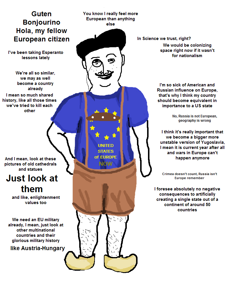 >>525846083Euros are very feminine in their argumentative styles. They get angry at you for not reading their minds, then turn their heads from you with a pout and pretend you're the one who's angry and that they are totally calm. They spent decades hating us for being war mongers, they hated us for cleaning up their messes (Suez Crisis, Vietnam), then they hated us for asking them to repay our support by helping us in the global war on terror, then they hated us for having bases in their countries (because war could never happen in Europe in the modern year), then they hated us when Trump warned Germany against being dependent on Russian gas, then they hated us for not sufficiently helping them defend Ukraine (even though we've been doing most of the work), then they hated us for trying to negotiate peace with Putin, then they hated us for wanting to pull out of NATO, now they hate us while pretending that they want us to pull all our troops out of Europe and leave them alone (but they also still want us to keep helping them). One one hand they say that Russians are asiatic mongols and that we are betraying the west by siding with Russia (simply because Trump negotiates with Putin to end the war), then on the other hand they say Europe and Russia are actually best friends and that they are only fighting because of the US, and that Russia should eventually join the EU.