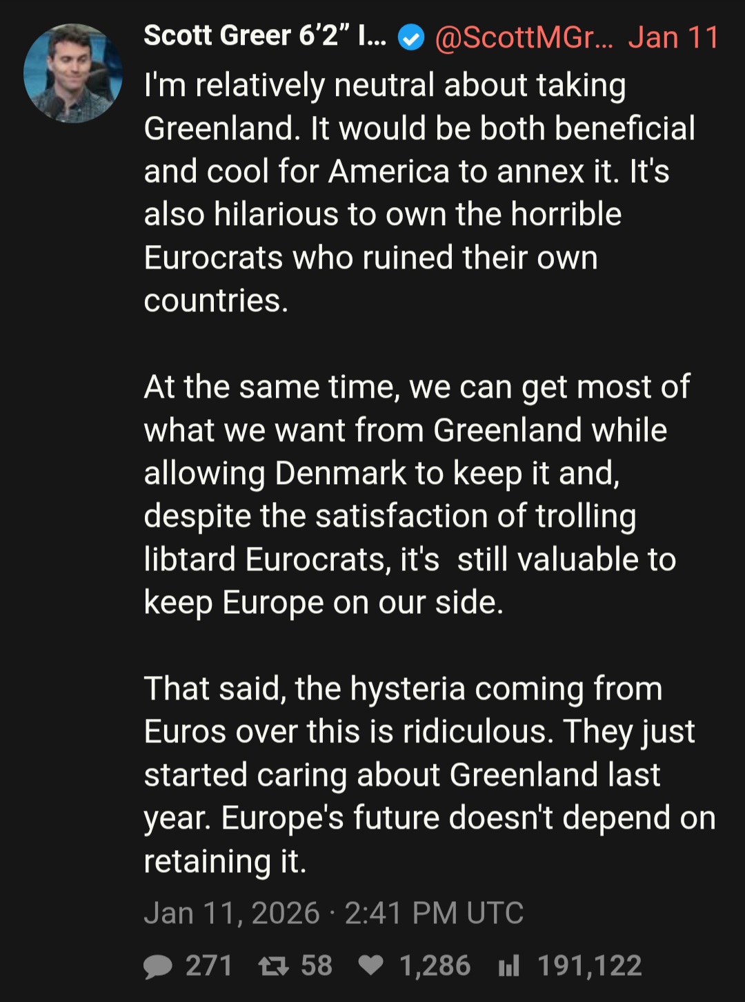 >>525849411He brings up a good point. You retards >>525846759 claim Americans didn't care about Greenland until Trump brought it up, but it was actually you guys who didn't care about it. I'm sure many of your libs even said you should let Greenland be independent because muh imperialism bad, but suddenly its a core part of Denmark's territory because Trump started talking about it. Americans have been fantasizing for at least a few decades about annexing Greenland, Canada, and the Panama Canal because if you look at a map it simply makes sense.