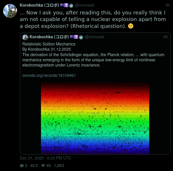 >>525844178He's not a "who"He gave out "Nuclear for Niggers">Korobochka (コロボ)>@cirnosad>31 Dec 2025>Relativistic Soliton Mechanics>By Korobochka 31.12.2025>The derivation of the Schrödinger equation, the Planck relation, ... with quantum mechanics emerging in the form of the unique low-energy limit of nonlinear electromagnetism under Lorentz invariance.> zenodo.org/records/18109461View SameOCRGoogleiqdbSauceNAOTrace 1717540447772943.png, 2MiB, 267